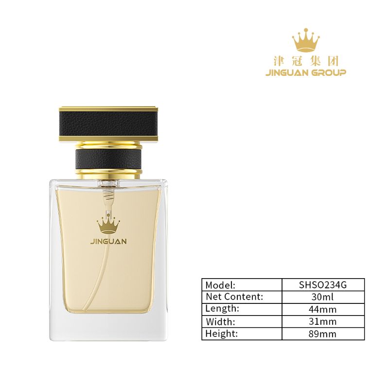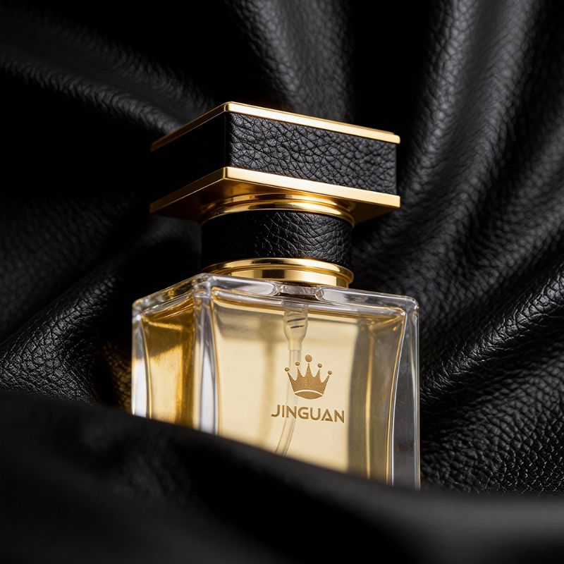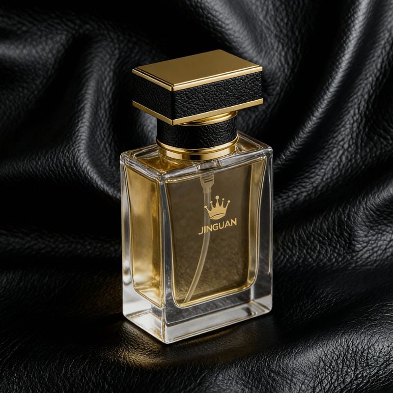 Its textured black leather-look cap paired with gold metallic accents enhances the bottle’s sculptural presence and delivers a luxurious contemporary appeal. The black-and-gold combination makes this design ideal for men’s fragrances, unisex scents, and sophisticated business perfume lines.