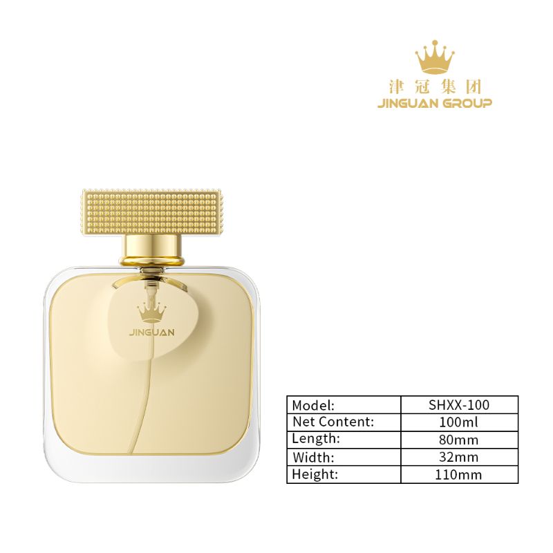 Its rectangular crystal-studded cap is the crown jewel of this design—adorned with meticulously arranged gold-toned crystals that catch and reflect the light brilliantly. The harmonious fusion of curved bottle lines and the cap’s structured geometry creates a bold yet elegant aesthetic, perfect for premium fragrance lines.