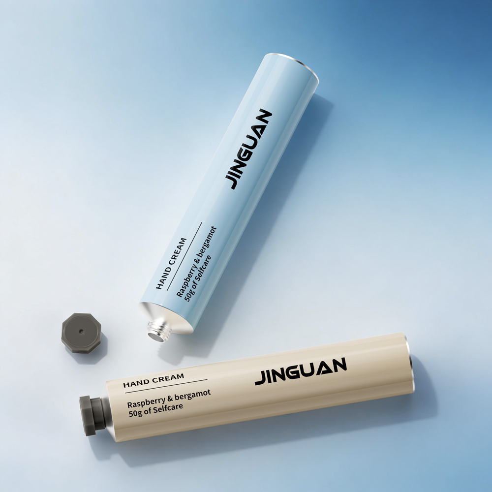 This pure aluminum hand cream tube is a premium packaging solution for beauty brands. It features a smooth, glossy aluminum body available in two elegant color options: a soft beige and a light blue, both paired with a modern gray screw cap. The aluminum material offers excellent barrier properties, protecting the hand cream from light and air to maintain product freshness and efficacy. The tube’s minimalist design with bold branding creates a high-end aesthetic that stands out on retail shelves.