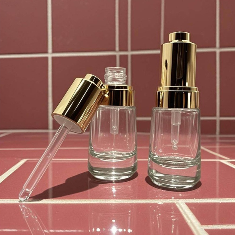 Elevate your serums and oils with our premium glass dropper bottles, featuring elegant gold or silver shoulder collars. The thick-bottom, high-clarity glass gives a substantial, luxurious feel, while the precision dropper allows for controlled, mess-free application.