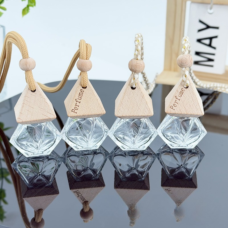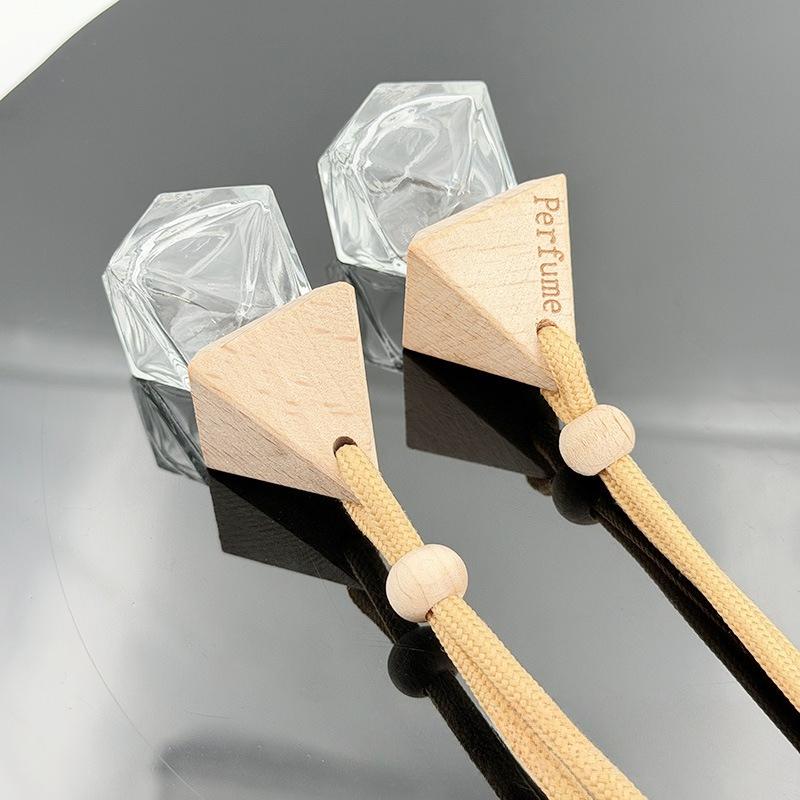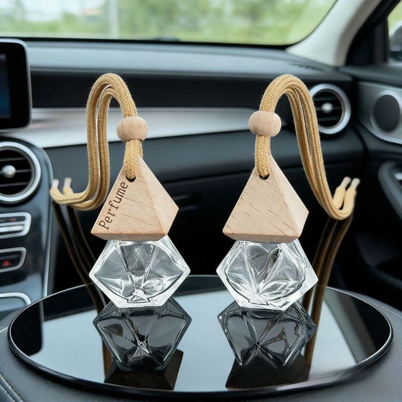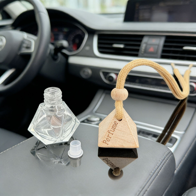 | Add a touch of style to any car with our 8ml diamond-shaped glass perfume bottle. Designed to hang from the rearview mirror, it’s the perfect mini size for car fragrance, essential oils, or scent samples.